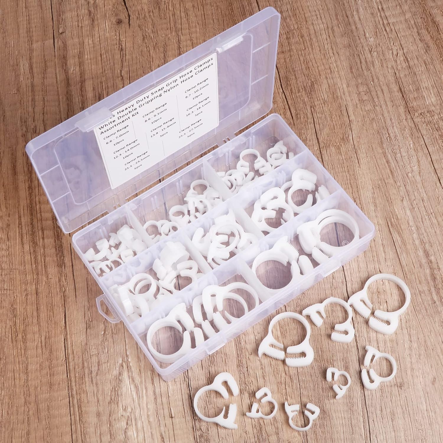 60 Pcs Heavy Duty Double Gripping Nylon Hose Clamps Assortment KitSpecifications:1>:Product Name: Snap Grip Hose Clamps;2>:Main Color: White3>:Material: Nylon;4>:Clamps Range:6.6〜7.0mm,8.6〜9.1mm,9.7〜10.2mm,12.3〜14.0mm,13.8〜15.4mm,16.3〜18.1mm,21.5〜23.5mm,25.5〜27.5mm;5>:Application:These Nylon Hose Clamps are ideal for use in automotive, electrical, marine, medical, agricultural, and many other applications. Package Included:List:Clamp Range---------------Color------------Quantity1>:6.6〜7.0mm---------------White------------10 Pcs2>:8.6〜9.1mm---------------White------------10 Pcs3>:9.7〜10.2mm-------------White------------10 Pcs4>:12.3〜14.0mm-----------White------------10 Pcs5>:13.8〜15.4mm-----------White-------------5 Pcs6>:16.3〜18.1mm-----------White-------------5 Pcs7>:21.5〜23.5mm-----------White-------------5 Pcs8>:25.5〜27.5mm-----------White-------------5 PcsPackage Quantity:Total 60 Pcs Double Grip Hose ClampsThe set is organized by size in a transparent storage case for quick access and protection.