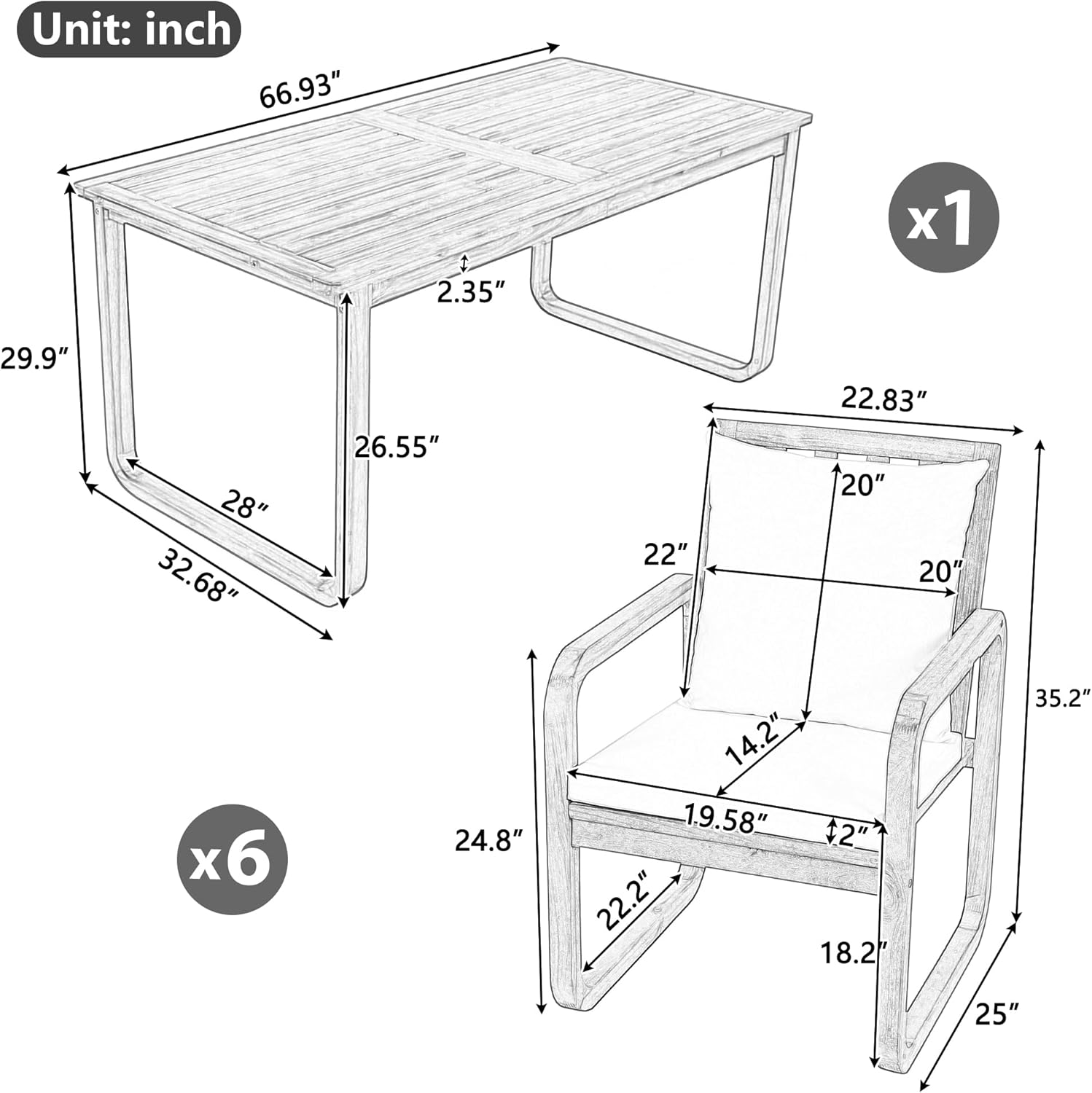 Upgrade your outdoor living space with this stylish and functional 7-piece patio dining set. Made from durable acacia wood, this set is built to withstand outdoor conditions while maintaining its natural beauty over time. The set includes a spacious rectangular dining table and six comfortable chairs, each equipped with water-resistant cushions for added comfort and convenience. The removable cushion covers allow for easy cleaning, making maintenance simple and stress-free. Designed with modern armrests and clean lines, this outdoor furniture set adds a touch of elegance to any patio, backyard, or garden. Whether you're hosting a family dinner, enjoying a weekend brunch, or entertaining guests, this set provides the perfect combination of comfort, durability, and style.