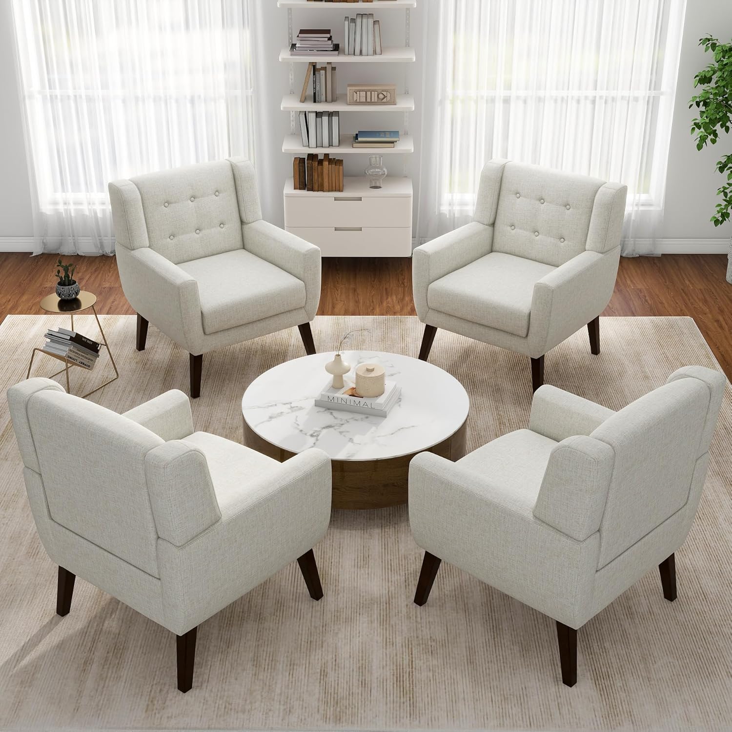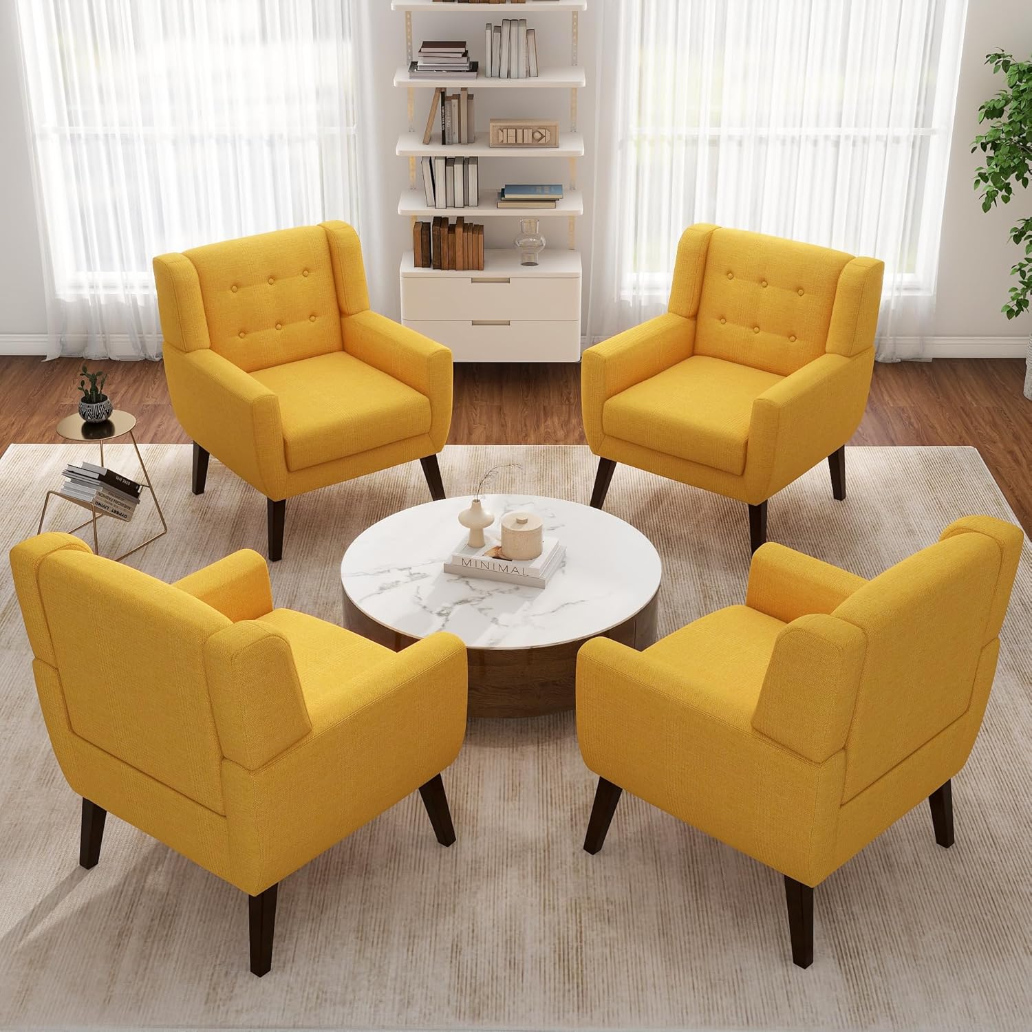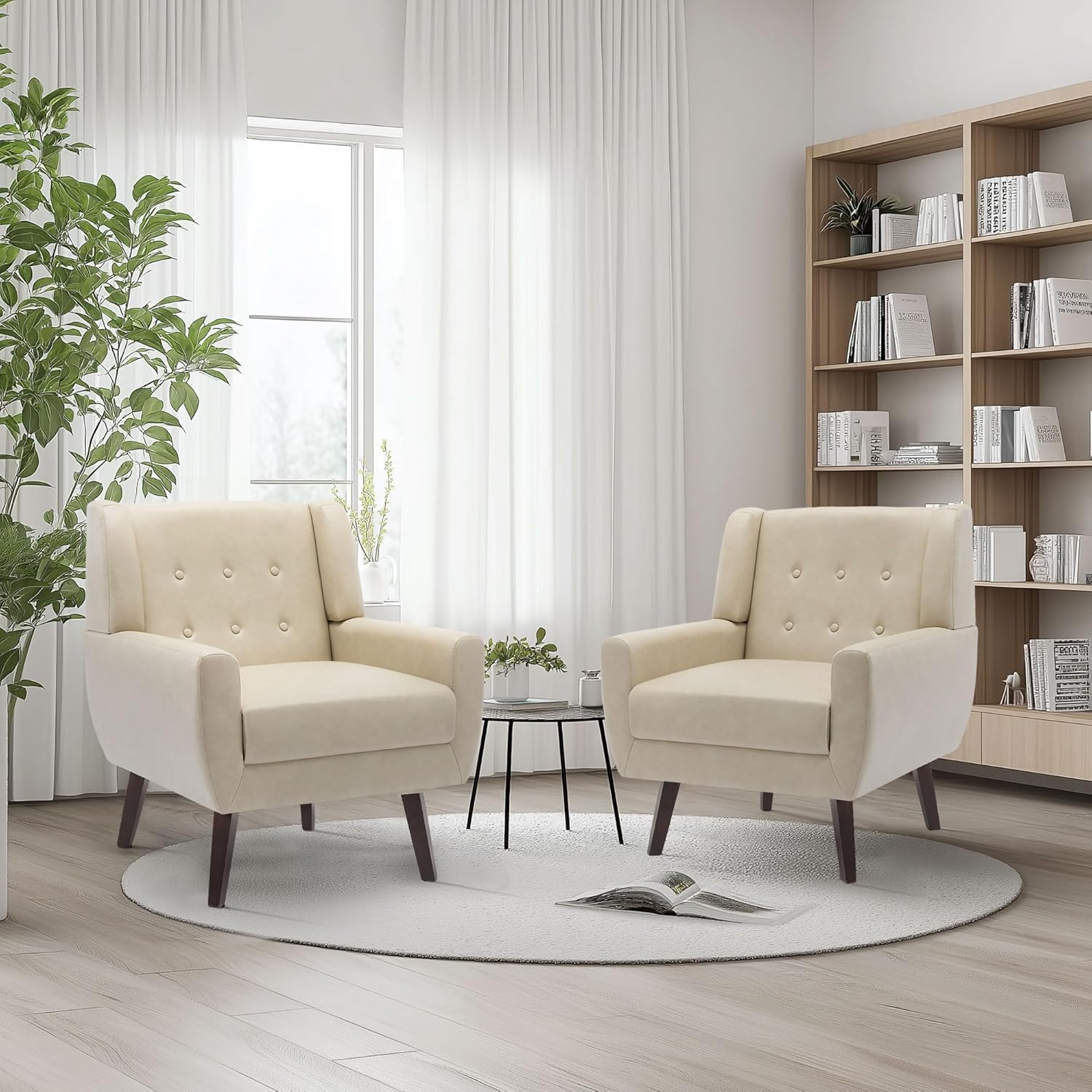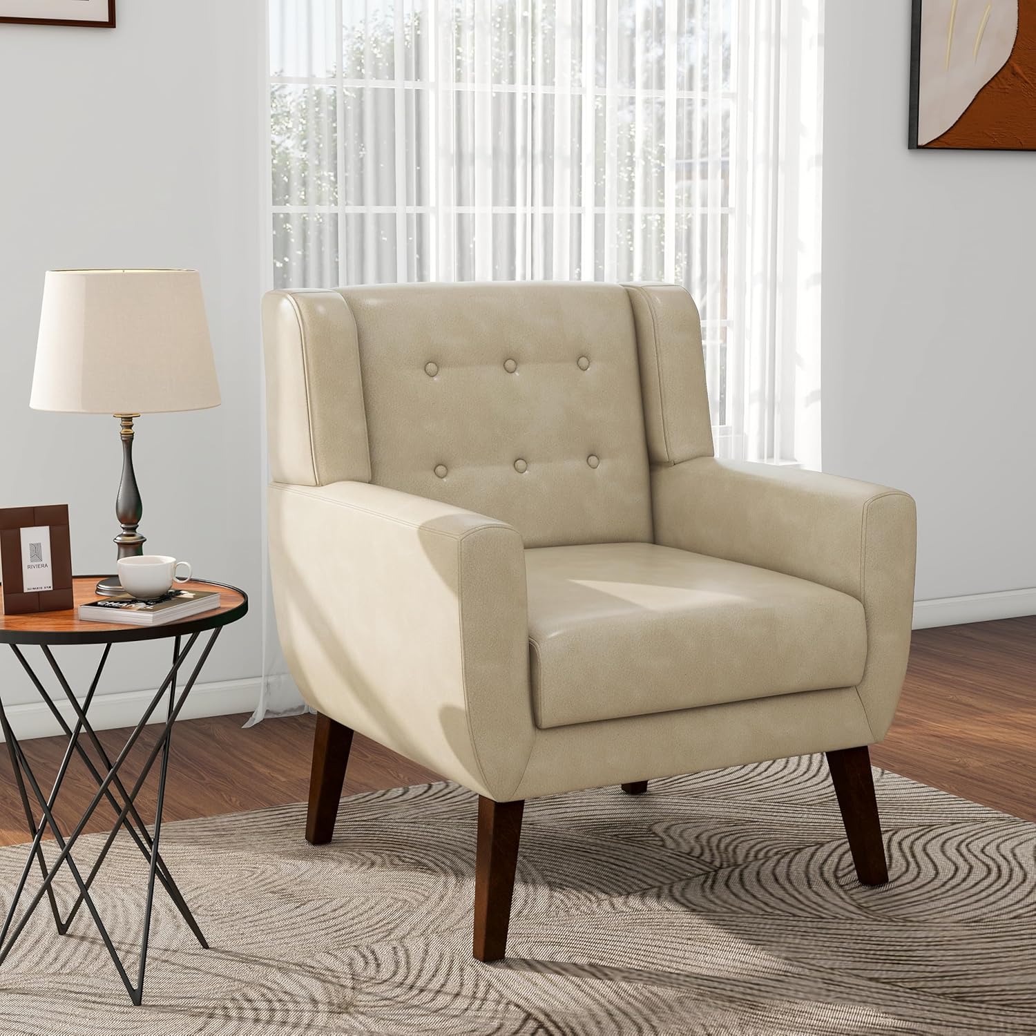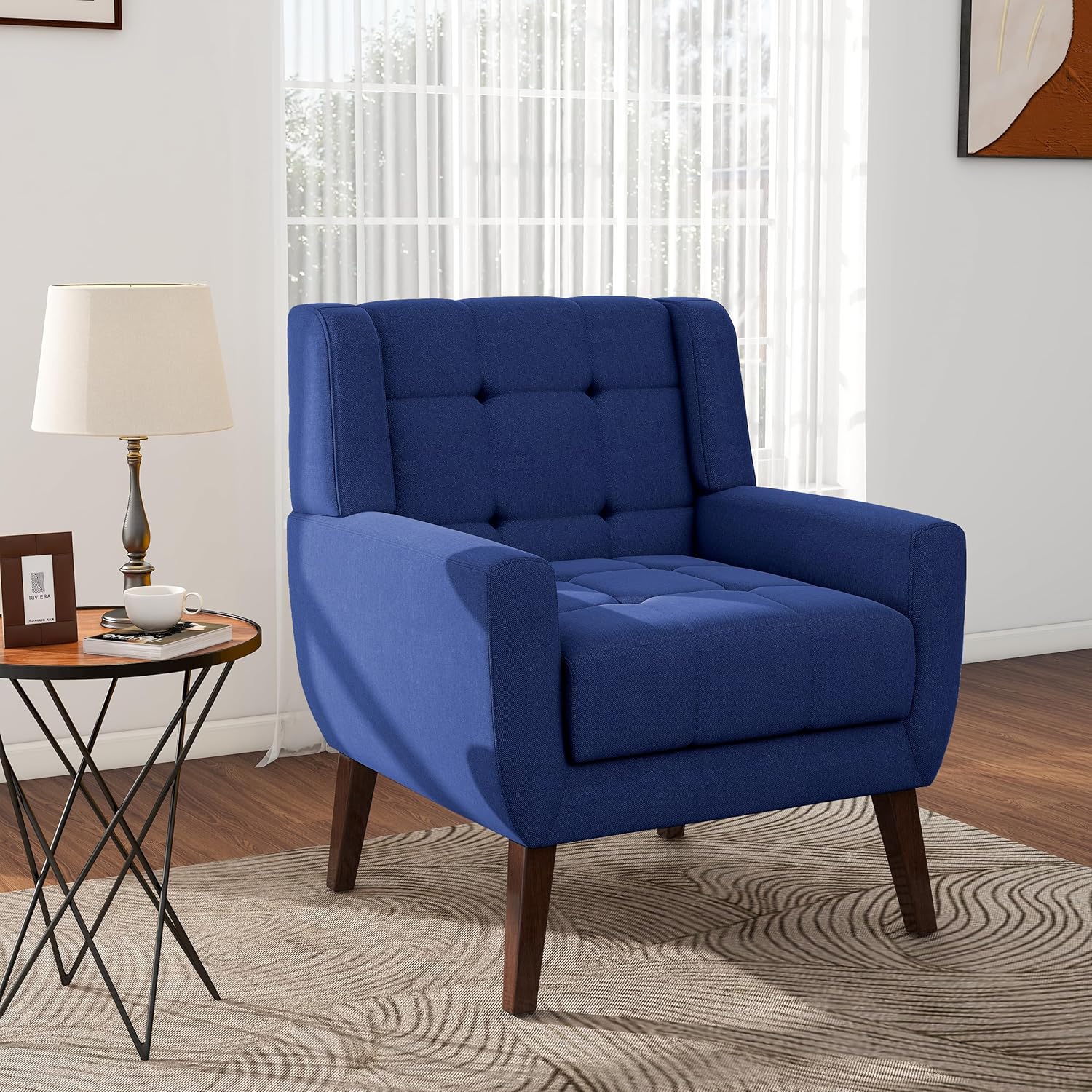 Our timelessly modern accent lounge chair looks good in any room. This mid century modern designed chair features a curved back and armrests that hug your body. The tufted upholstery and linen fabric give a polished look to this living room accent chair, while strong wooden legs splayed out mirror the vintage style. Our accent arm chair will take you back in time and help recreate the classic look you want.