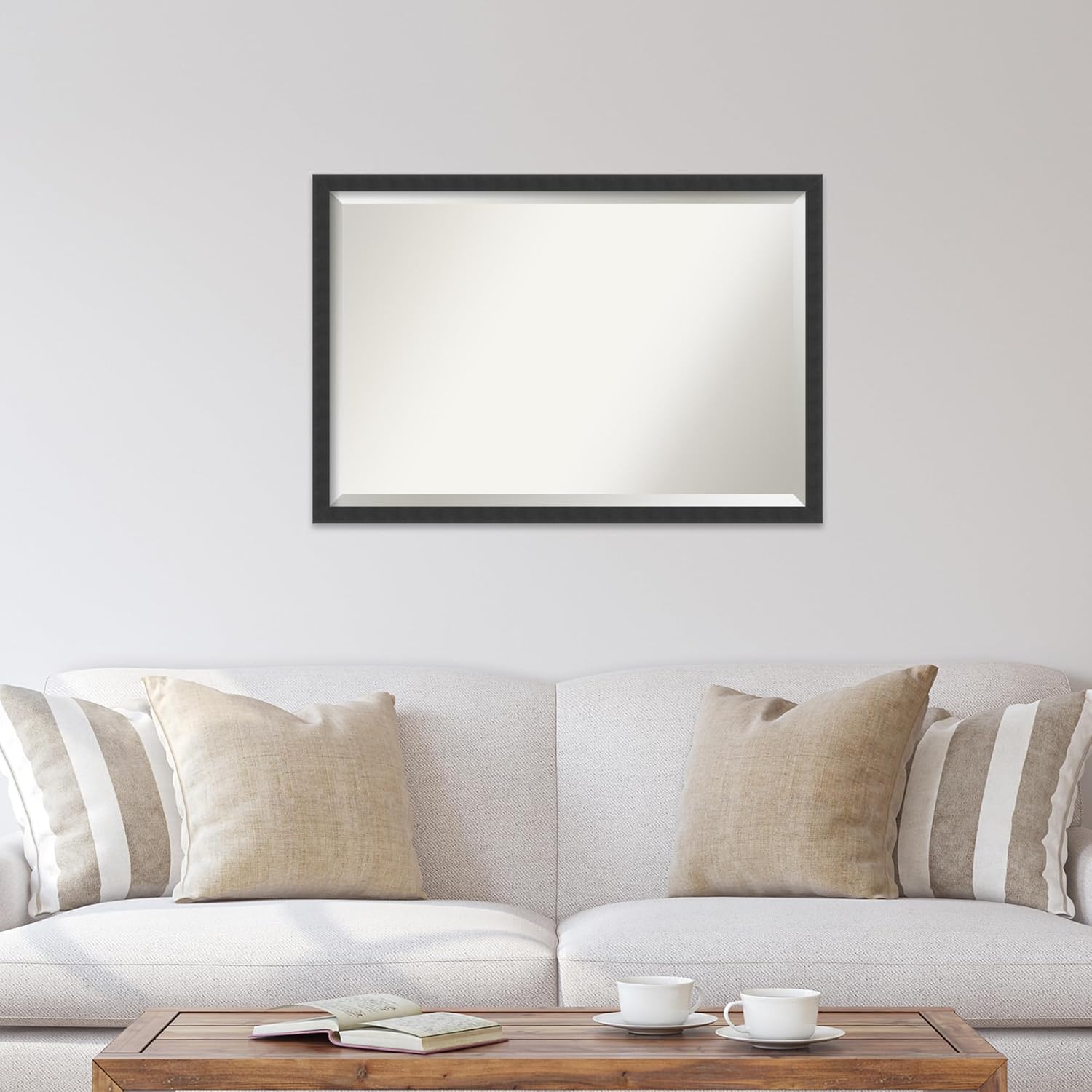 PRODUCT: Amanti Art Beveled Wood Wall Mirror; OUTER SIZE: Exactly 38.25 x 26.25 inches; FRAME: Mezzanotte Black; FRAME FINISH: Matte; FRAME COLOR: Black. The Mezzanotte Black frame is a black frame with a flat surface and a smooth, matte finish. Give your home or office the finishing touch with this 100% real wood-framed wall mirror. Individually made using traditional custom framing techniques, it has the quality you would expect from your local frame shop. It holds its value with premium finishing that can be appreciated up close. Because of our attention to detail and focus on artistry, architects, interior designers, and homeowners alike choose this mirror to create beautiful living spaces.