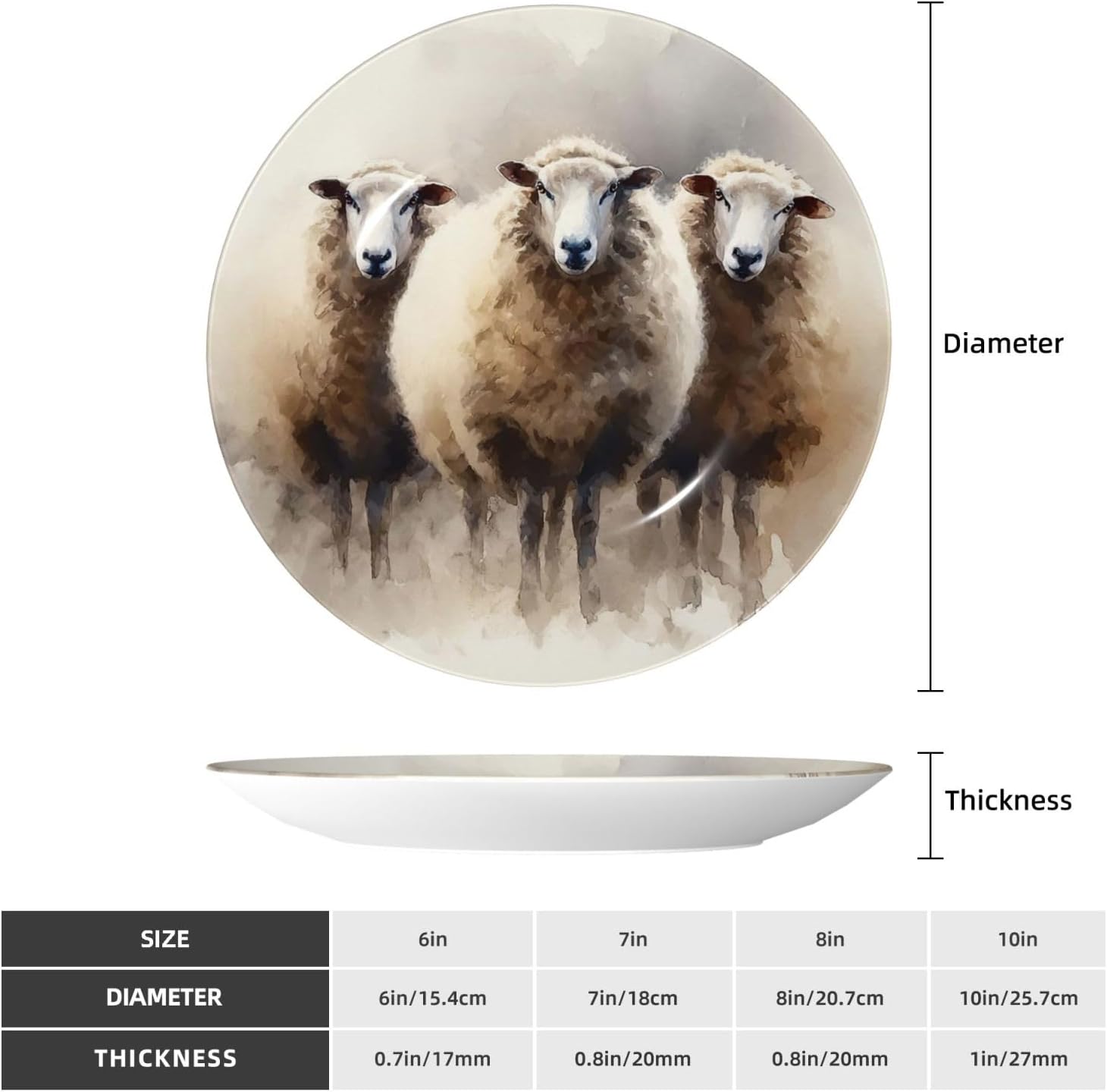 gokays decorative platedo you feel that your table is monotonous? Then use our decorative plate to add a little fun to the monotony of life.featuressize - 6 inch diameter;7 inch diameter;8 inch diameter;10 inch diametermaterial - ceramic design - Sheeps Watercolor package - 1 x ceramic decorative plate, 1 x stand, 1 x pothookwhy choose gokays decorative plates?advantageas manufacturers we follow current trends and bring you the latest home fashion. Salad plates ideal for placement at home or in the office. Traditional porcelain making technology, fine workmanship. Ceramic dinner plates is a good gift for family and friends.convenient to useour dinner plates rack for display has 2 ways to use, you can just place the bracket base on a flat surface first, and then put the plate on it, also you can stick the provided pothook at the back of the plate, and then stick the plate on the wall, you can choose the suitable installation method according to the actual situation.occasionour ceramic ornaments salad plates is a perfect decorative and collection for any niche, table, or mantle at your home. Perfect for your office, home, living room, dining room, playroom, kitchen, cafe, study, studio, club, bar, and others.in a surprise for your family and friends!porcelain dessert plates is a perfect gift for any person in your life. You can give it directly to your lover as mother's day gift/father's day gift/birthday gift/christmas gift/valentines day gift/anniversary gift/wedding gift/housewarming gift/new home gift.start with our funny decorative plate, refresh your rooms!