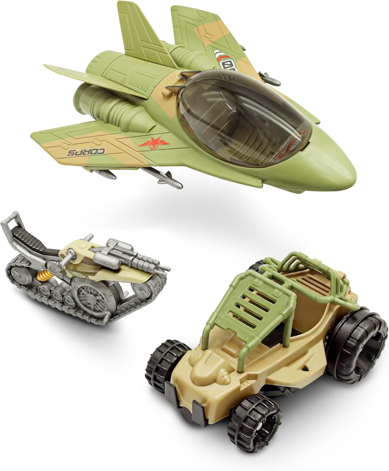 LANARD THE CORPS! MISSION TERRAIN BATTLE - As crisis erupts on the world stage, The Corps! is ready to fight off The Curse! and other forms of evil that surface. Strange blackouts, intense weather patterns, shadows moving in the background of governments signal difficulties from past and future threats. The Corps! stands as a beacon of hope and has been leading the charge to defend the Universe since 1985. Are you ready to conquer darkness and bravely defend all that is good? Join the team and get gung-ho with The Corps! A complete battle-ready set for the action figure enthusiast! Create exciting battle scenes and launch operations between The Corps! and the Curse! that you control! The Mission Terrain Battle set is a complete array of action vehicles and accessories that include a jet plane, watch tower, bunker, tank cycle, attack sand buggy and weapon sprue. The set also includes 4 action figures and unique weapon accessories and gear for each figure. These highly detailed action figures are 4” tall or 1/18 scale and are poseable for play and display. Recoil, Dozer and Buckshot are ready to defend the universe against the evil Reaper. For children aged 3 and up. Collect the entire lineup of The Corps! action figures and action vehicles from Lanard.