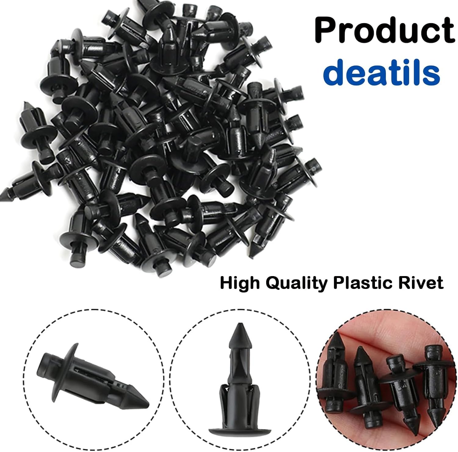 【High Quality Plastic Rivet Clip】 The fairing and door panel fixing clip made of high quality plastic material, durable and impact resistant. 【Easy to Use】These rivet clips are perfect for holding anything that needs to be fixed properly, the head pushes and expands to keep the clip firmly in place. 【Wide Application】Widely used for fixing door edges, car bumpers, bumpers, door panels, panels, brackets, fasteners, etc. 【Package Contents】Vehicle Mount Trim Clip Set will give you 50 pcs fixing rivet clips. Please check the size, type and shape as much as possible to make sure the item is what you need.