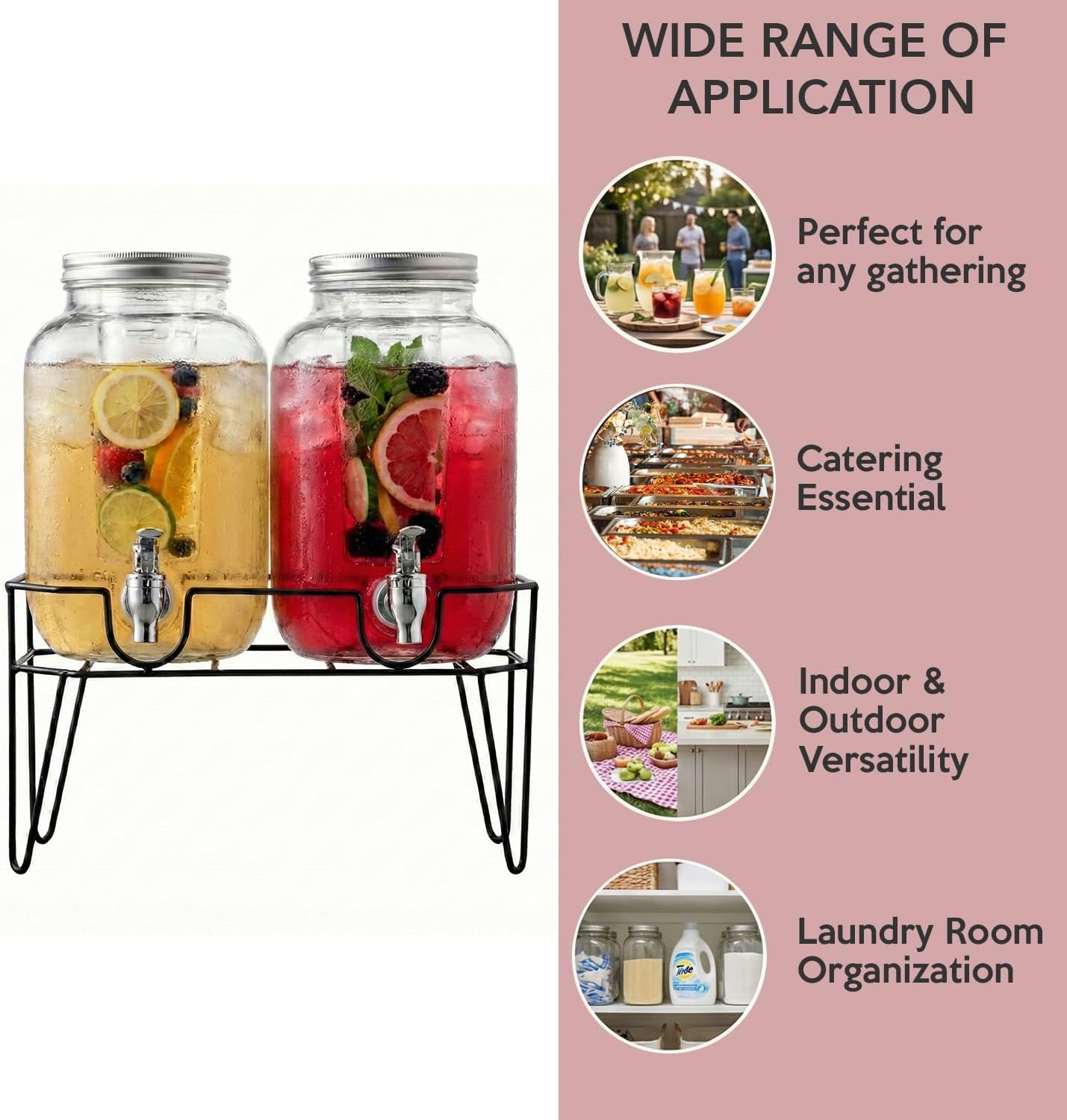 Serve up lemonade, sweet tea, OJ or other drinks in farmhouse fashion with this set of two drink dispensers. The mason jar design gives them a country-to-the-bone look, and spigots on the fronts of the jars allow for easy self-service. A metal holder lifts the jars up from the counter for easy access with taller glasses.