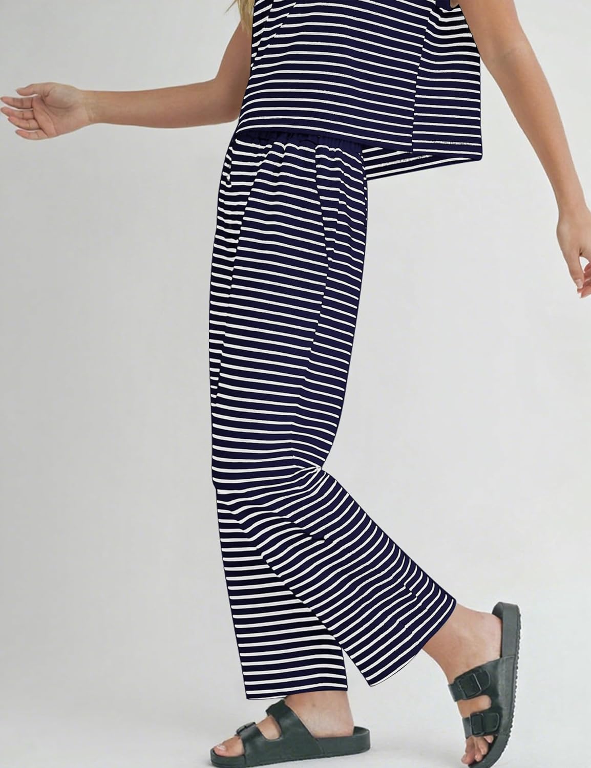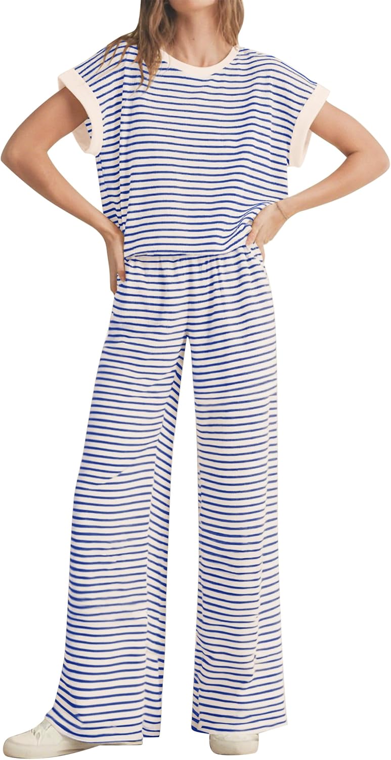 Burtell Women Striped 2 Piece Lounge Sets Crew Neck Short Sleeve T Shirt Tops Wide Leg Pants Sets Summer Matching Pajama Set